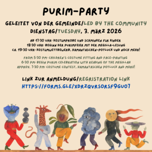 • ca. 19:30 Uhr: Kostümwettbewerb, Hamantaschen-Potluck und noch mehr!
